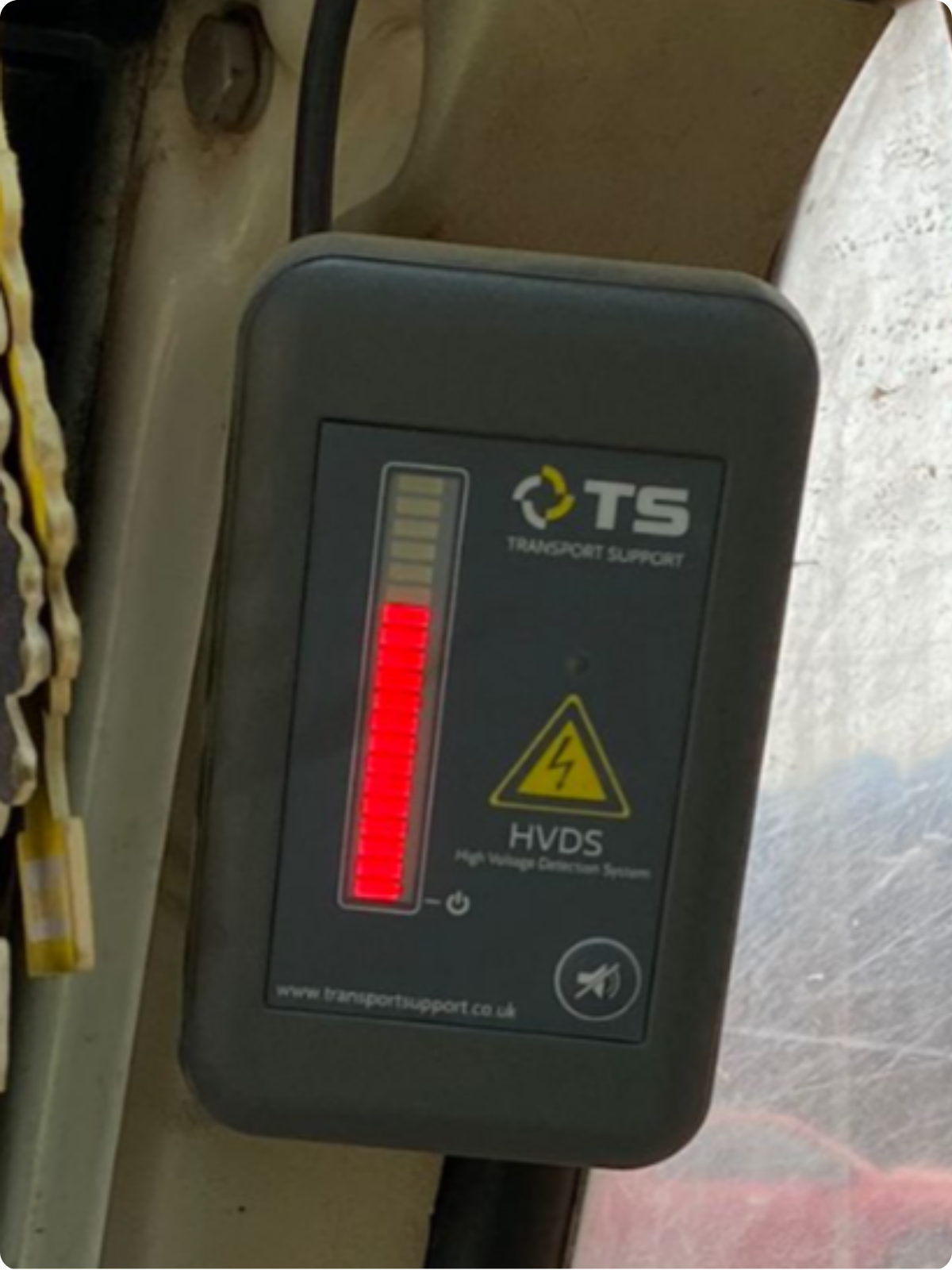 Esto advierte al conductor del vehículo sobre el peligro potencial de las líneas eléctricas aéreas. Se suministra como una unidad independiente (11-32v) o como parte integrada de los sistemas de seguridad del vehículo.